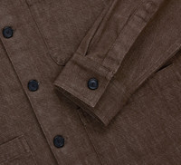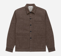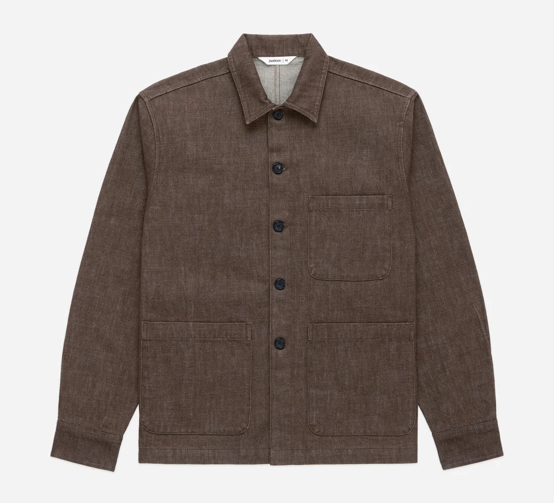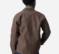 The Shop Jacket is designed with a nod towards classic European chore coats. It features three generous, rounded front pocket and a boxy fit for easy but functional wear. We chose a hefty brown Japanese denim that has a rich brown hue with a subtle snowy effect from the white weft. The jacket is finished with genuine horn buttons. Details - 100% Cotton denim woven in Japan - Straight bottom hem - 3 pocket front - Horn buttons - Made in India