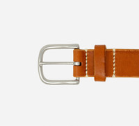 Our belts are cut from 4mm thick cowhides that are vegetable tanned in Japan by the Tochigi Leather Company. The belts are all hand-sewn and feature brass buckles, waxed and beveled edges, leather keepers, and a branding stamp on the inside of the belt. Made in Japan. Please note: Our brass buckles have a nickel coating. Details - Vegetable tanned leather - 1.5" width - Brass buckle - Made in Japan