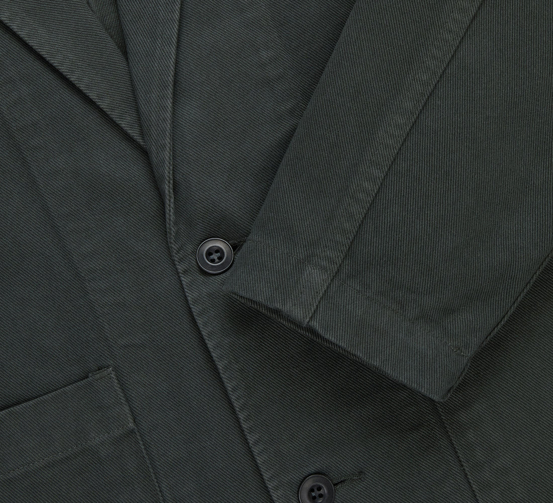 The Work Blazer is a casual take a blazer with workwear detailing, low button stance, wider lapel, and comfortable fit. It's crafted in a heavyweight chino fabric with a pronounced twill weave that after sewing is garment dyed and rinsed for a broken in feel. Finishing it off are two large front pockets, two interior pockets, and corozo buttons. Details - 100% Cotton - Button front closure - Two interior pockets - Made in Portugal