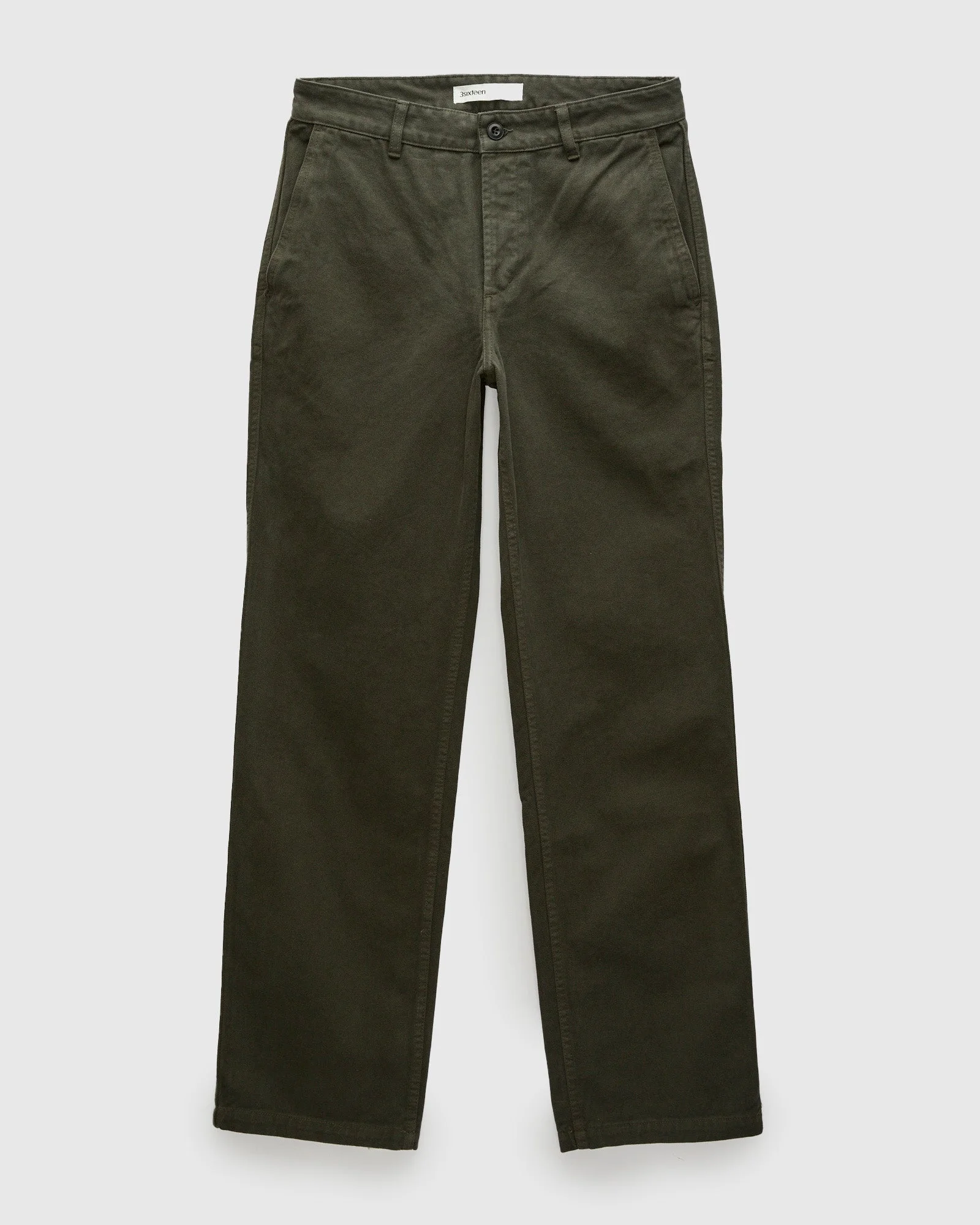 The Work Pants from 3sixteen feature a straight leg, high rise fit reminiscent of traditional workwear. Cut from a heavyweight cotton chino fabric, the pants showcase a pronounced twill with a structured drape. After sewing, the pants are garment dyed and rinsed, giving the fabric a soft, broken-in look and feel. Finished with natural corozo buttons, slant pockets at the waist, and welt pockets at the rear. - Straight leg, high rise fit - Heavyweight cotton twill fabric - Garment dyed - Welt back pockets - Slant pockets at the waist - Natural corozo buttons - Trouser hem - 100% cotton - Made in Portugal - Please note: Due to the nature of this fabric, hemming is not available for this item. Founded in 2003 in New York City's Lower East Side, 3sixteen aims to create collections that demonstrate longevity in both design and construction by producing clothing that will hold up to extensive wear and remain relevant season after season. The brand's aesthetic is built upon utilitarian pieces from decades past that are updated with premium materials and modern fits. The collection is handsewn in the USA of the finest fabrics, ensuring that every piece has a compelling story to tell.