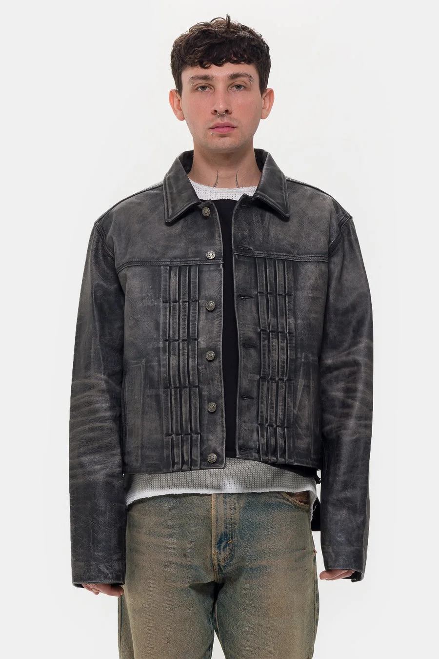 424 leather trucker jacket in black. Features regular fit, fold down collar, and vintage washed treatment. Fit - Men's regular fit Feature - Regular fit Fabrication - Material: 100% calf leather SKU: FF5SMJ20AP-PE245.999-46