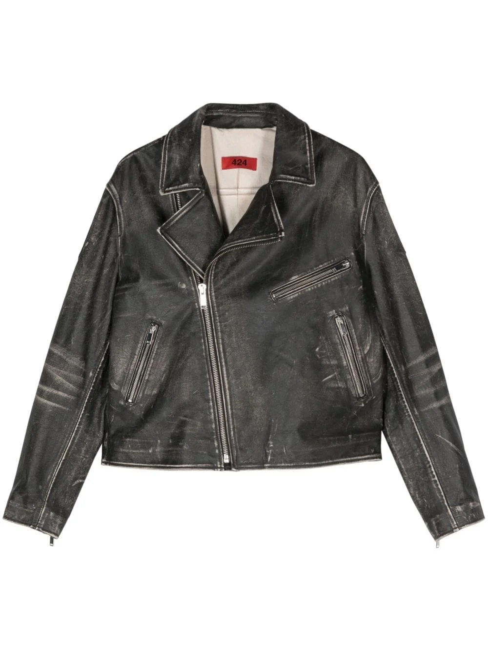 leather biker jacket Highlights - Black - Calf leather - Distressed effect - Faded effect - Notched lapels - Long sleeves - Cuff zips - Zip-fastening chest pocket - Two side zip-fastening pockets - Internal zip-fastening pockets - Full lining - Straight hem - Off-centre front zip fastening Made in Italy Composition Outer: Calf Leather 100% Lining: Cotton 100%
