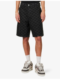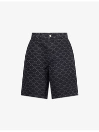 PRODUCT DETAILS - A Bathing Ape denim shorts - 100% cotton - Button and button-fly fastening - Relaxed fit, mid-rise, structured waistband with belt loops, slip pockets at front, pocket at side, brand applique at side, pockets at back, all-over brand monogram pattern, branded hardware - Machine wash cold - Size medium: rise 13in / 33cm, inside leg 9.5in / 24cm, leg opening 26in / 66cm - Model is 6ft 2in/1.88m and wears a size medium - Midweight, non-stretch Ref: R04438008