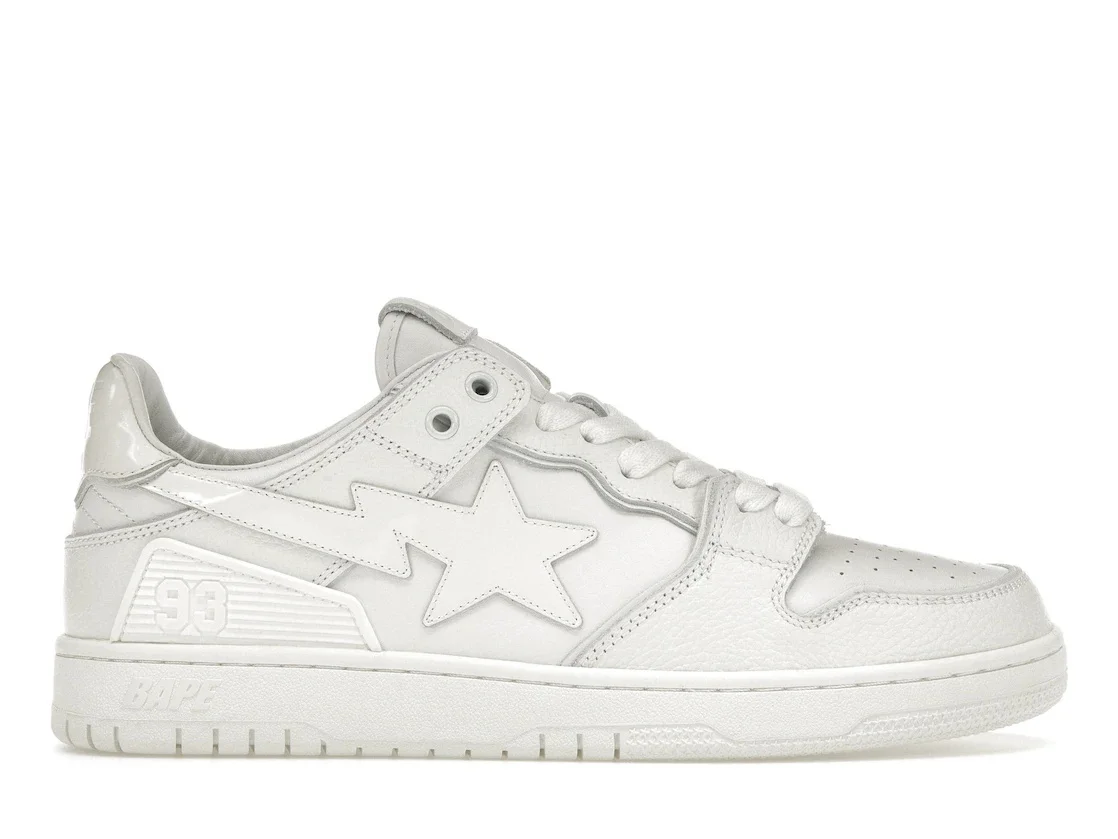 The A Bathing Ape Bape SK8 Sta Triple White Patent Leather Sta Logo is an all-white colorway shoe which has borrowed most of its features from skating shoes. The upper of the A Bathing Ape Bape SK8 Sta in Triple White Patent Leather Sta Logo is made of patent leather, making it feature a vintage look. The counter lining of the shoe is made of smooth leather, which makes it comfortable, easy to clean, and an everyday option. It also has a round toe, which has small holes on the toebox for breathability. We believe that one of the most distinctive features of the A Bathing Ape Bape SK8 Sta Triple White Patent Leather Sta Logo is the use of the silver metal signature BAPE STA logo and the branded heel counter. The shoe also has a absorbing effect due to its flat, thick rubber sole. The shoe was released on October 21st, 2022, at a retail price of $180. - Style 1I70-191-010/1I70-291-010/001FWI701010I-WHT - Colorway White/White/White - Retail Price 180 - Release Date 2022-10-21 - Featured false