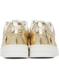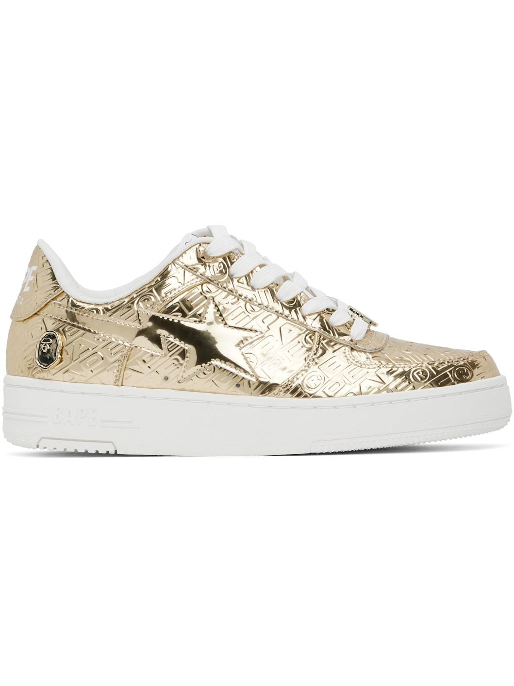 Low-top patent faux-leather sneakers in gold tone. - Logo pattern embossed throughout - Logo charm at lace-up closure - Logo patch at padded tongue - Padded collar - Logo hardware at outer heel - Graphic applique at sides - Logo embossed at heel tab - Buffed leather lining - Logo embossed at textured rubber midsole - Treaded rubber sole Supplier color: Gold
