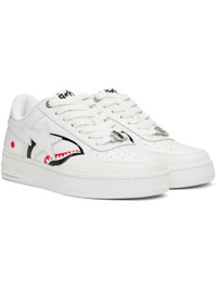 Low-top buffed leather sneakers in white. · Perforated detailing at toe · Logo hardware at lace-up closure · Logo flag at padded tongue · Padded collar · Graphics embossed at sides · Logo applique at sides · Logo embossed at heel tab · Text embossed at heel counter · Mesh lining · Logo embossed at textured rubber midsole · Treaded rubber sole Supplier color: White