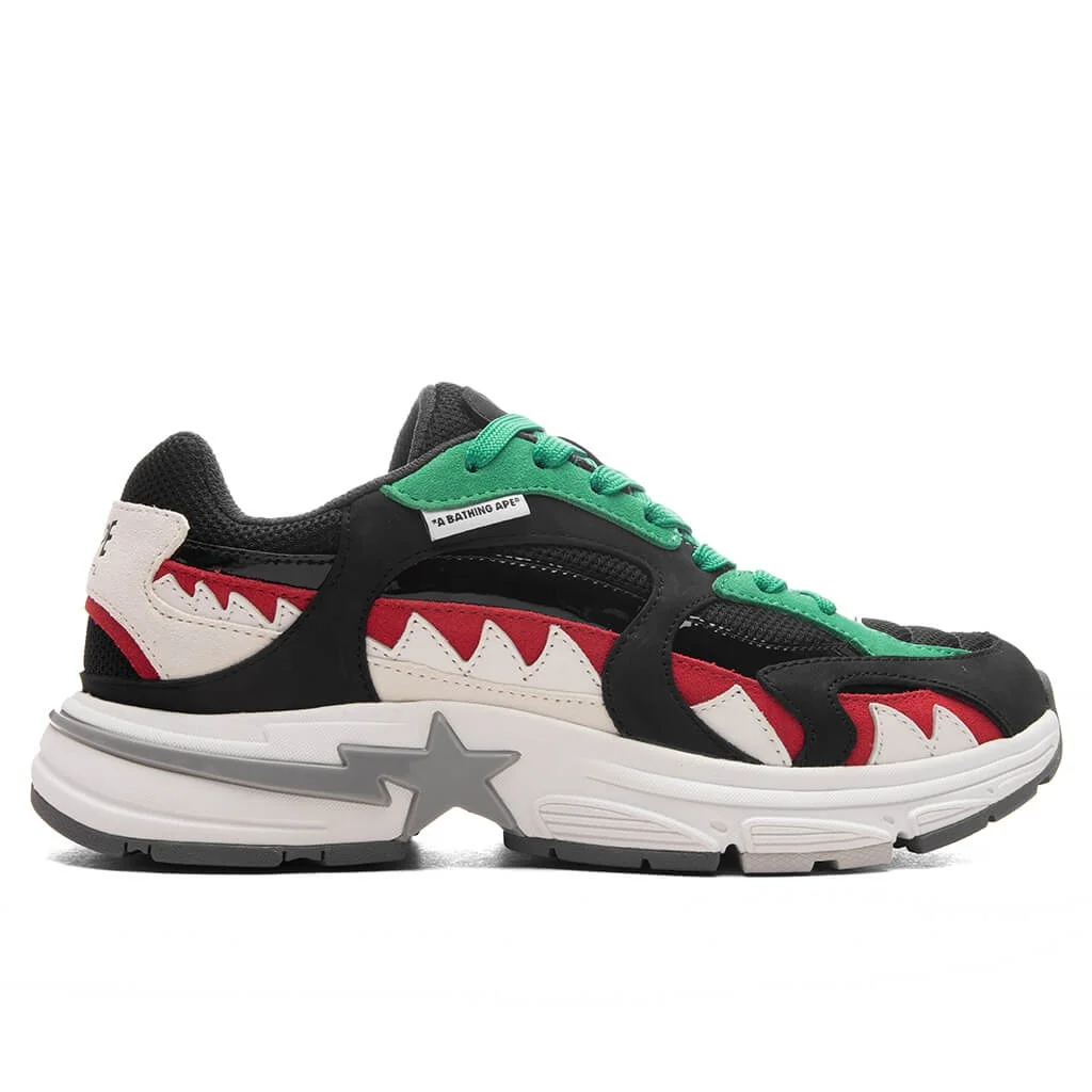 A bold evolution of BAPE’s signature sneaker design, the Shark STA blends premium materials with unmistakable street energy. This low-top silhouette arrives in a fresh colorway, constructed from a mix of materials like patent leather, suede, and mesh for a dynamic, layered look. Graphic appliques at the side panel nod to the brand’s iconic motifs, while a logo patch at the padded tongue and a branded heel tab reinforce its heritage. The shoe is finished with a mesh lining, cushioned midsole with logo detailing, and a treaded rubber outsole. - Leather construction - Mesh lining - Graphic appliques - Lace closure - STA logo - Rubber outsole - Style No: 001FWK201309M-BLK