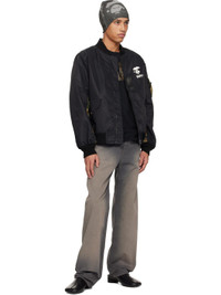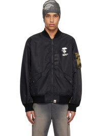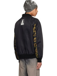 Nylon twill bomber jacket. - Paneled construction - Rib-knit stand collar, hem, and cuffs - Zip closure - Logo printed at chest and back collar - Webbing trim at front - Flap pockets - Logo flag at hem - Logo camouflage pattern printed at sleeves - Utility pocket and pen slots at sleeve - Welt pocket at interior - Full sateen lining - Logo-engraved silver-tone hardware Supplier color: Black