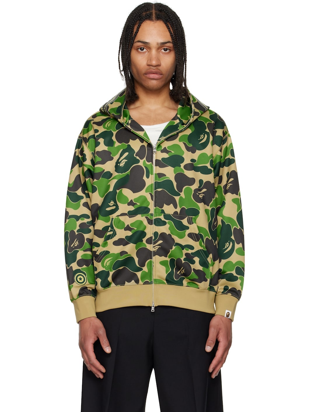 Polyester jersey hoodie. Logo camouflage pattern printed throughout. · Faux-leather logo graphic patches at hood · Two-way zip closure extends to hood · Patch pockets · Rib-knit hem and cuffs · Dropped shoulders · Faux-leather graphic patch at cuff · Logo flag at cuff · Logo-engraved silver-tone hardware Supplier color: Green 100% polyester. Made in China 251546M202058