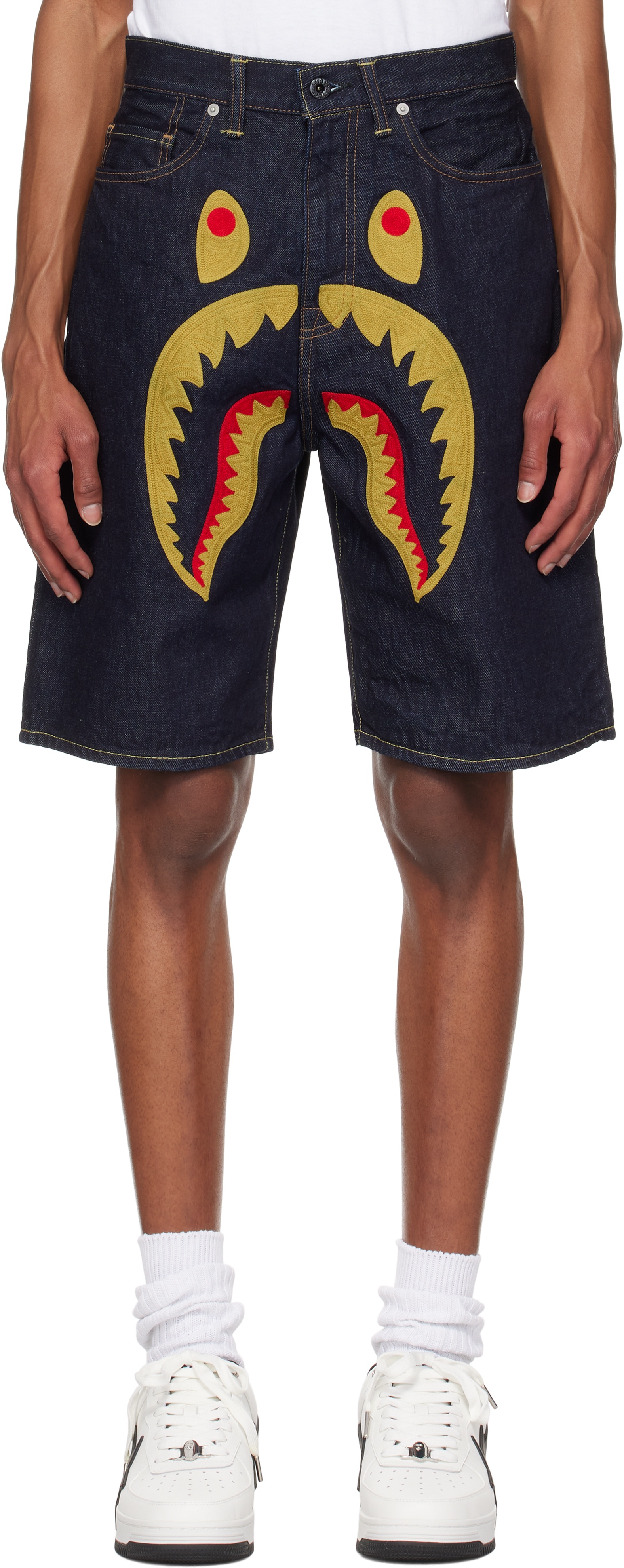 Non-stretch denim shorts. · Belt loops · Five-pocket styling · Zip-fly · Graphic appliques at front · Leather logo patch at back waistband · Logo flag at back pocket · Contrast stitching in yellow and tan Supplier color: Indigo