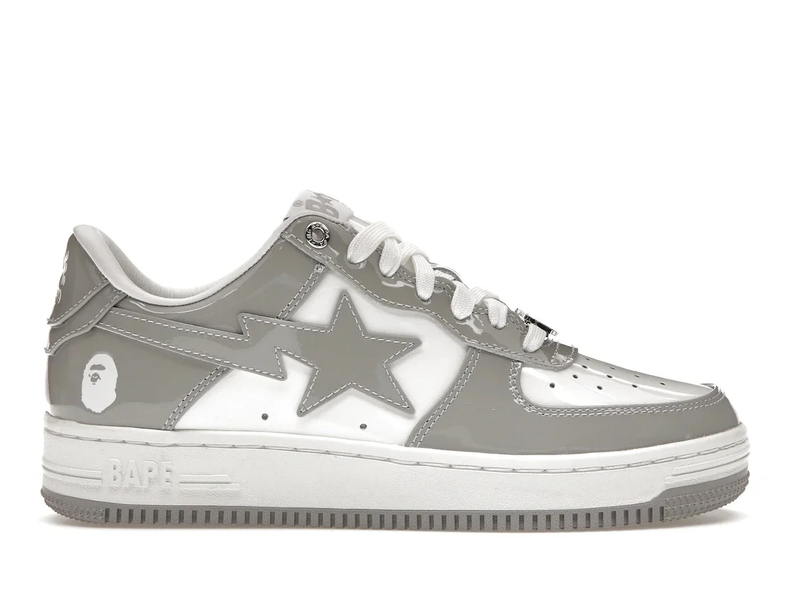 The A Bathing Ape Bape Sta Patent Leather White Gray (2023) takes an iconic low-top silhouette from the on-trend Japanese streetwear brand and dresses it in a subtle colorway that shines. The A Bathing Ape Bape Sta in a white and gray colorway with Patent Leather (2023) features the signature upper of smooth white leather. Gray patent leather overlays add shine as they adorn the upper and craft the shooting star Swoosh. White laces match the sock liner and the Bape Sta branding on the heel tab. The A Bathing Ape logo that appears in white on the lateral heel and as a lace jewel complete the classic look of this upper. What we enjoy the most about this lifestyle sneaker is it's dependable and always fashionable sole unit. A white foam midsole with tonal stitching and Bape branding rests atop a gray rubber outsole with circles and stars. The A Bathing Ape Bape Sta Patent Leather White Grey (2023) debuted on January 27, 2023, for $220 retail. - Style 1I70-291-021/1I70-191-022/0ZXSHMX91001J-GYA/0ZXSHWX91001J-GYA - Colorway White/Grey - Retail Price 220 - Release Date 2023-01-27 - Featured false