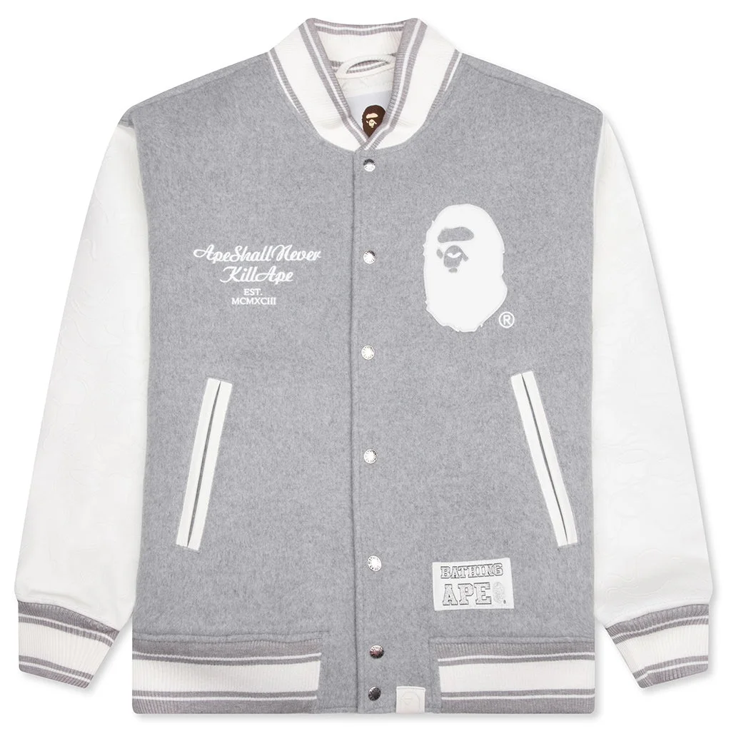 The Bape Varsity Jacket in Gray, exclusively available at FEATURE, combines classic varsity styling with Bape's distinctive detailing. Constructed from a durable wool and nylon blend, this jacket features a leather badge, woven sleeve designs, and a tuft-stitched embroidered badge. Terry loop accents and ribbed trims add texture, while a crewneck front and side slip pockets complete the design with a refined, timeless touch. 001FEA730243F GREY - 90% Wool, 10% Nylon - Leather badge - Woven designs on sleeves - Tuft stitch embroidered badge - Terry loop badge - Crewneck front - Side slip pocket - Ribbed trims - Style No: 001FEA730243F-GRA