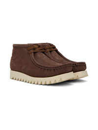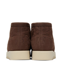 High-top nubuck desert boots in brown. Logo pattern embossed throughout. · Square moc toe · Text embossed at vamp · Lace-up closure · Bellows tongue · Grained leather lining · Foam rubber midsole · Treaded Vibram® rubber outsole Supplier color: Brown