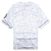 Inspired by baseball aesthetics, the Camo Stripe Baseball Shirt features a full polyester mesh construction. Covered in the signature BAPE camo print and stripes, the shirt is decorated with embroidered wordmark, number, and graphic patches. The full snap-closure and black piping on the collar, placket, and sleeves stays true to the baseball feel. Finished with woven label tags at the front for distinguishable branding. - 100% Polyester - Mesh fabric - Allover camo and stripe pattern - Snap-closure - Piping on collar/placket/sleeves - Embroidered patches - Woven brand labels - Style No: 001SRL301003M-GRA