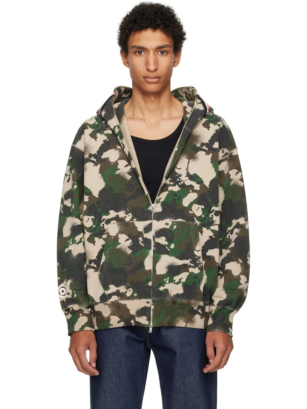 French terry hoodie. · Logo camouflage pattern throughout · Printed graphic and graphic appliques at hood · Two-way zip closure extends to hood · Patch pockets · Rib-knit hem and cuffs · Dropped shoulders · Logo flag at cuff Supplier color: Green 100% cotton. Made in Japan 251546M202047