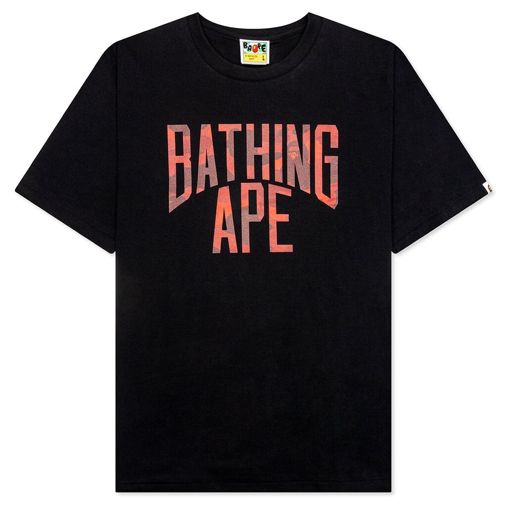 The Color Camo Bathing Ape Tee in Black offers a blend of comfort and bold design. Made from cotton, this tee features a relaxed fit with dropped shoulders and a classic crewneck for a laid-back silhouette. A screen-printed script at the front adds iconic branding, while a brand tab at the cuff provides a subtle finishing touch. - 100% Cotton - Relaxed fit - Crewneck - Dropped shoulders - Brand tab at cuff - Screen printed script at front - Style No: 001TEK801023M-BLK