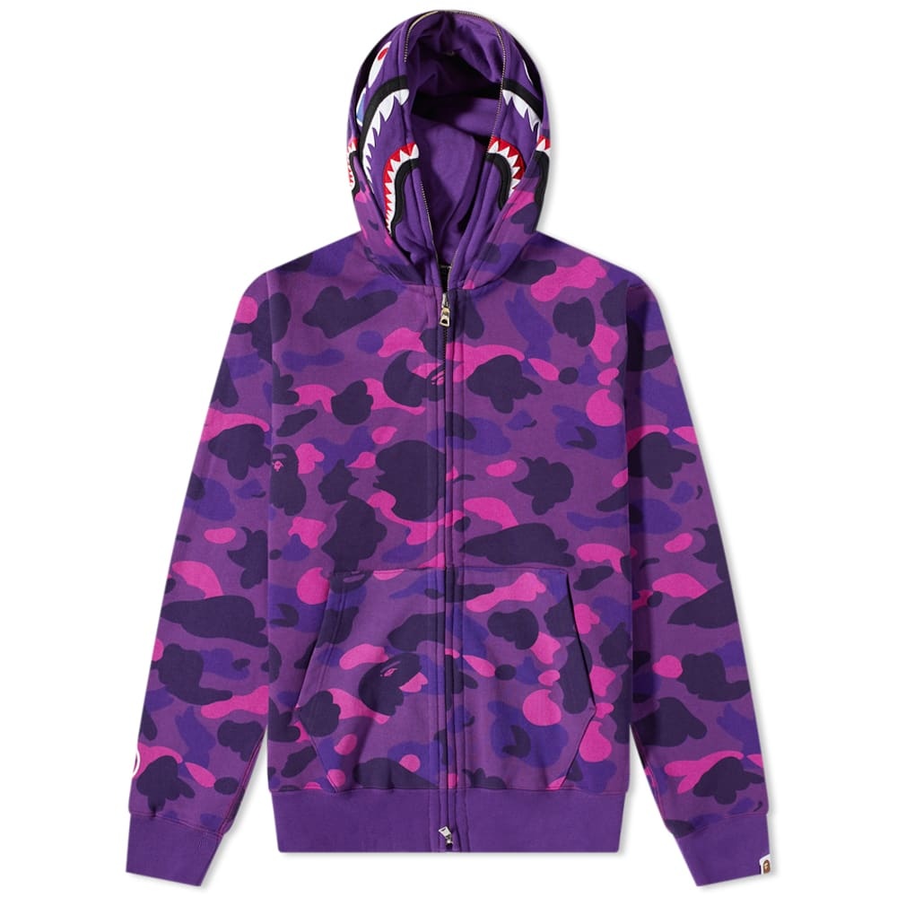 Undeniably A Bathing Ape, this pruple zip-up hoody combines some of the iconic hallmarks of the streetwear brand. It’s made in Japan from cosy loopback cotton and designed with a unique, double-layered hood that shows off the label’s signature camo shark and tiger mascots in contrasting colours. - 100% Cotton - Loopback Jersey - Fixed Hood - 2 Way Zip Closure - 2 Side Pockets - Printed Branding - Woven Brand Tab - Ribbed Trims - Made in Japan - Style Code: 001ZPH801010M-PUR
