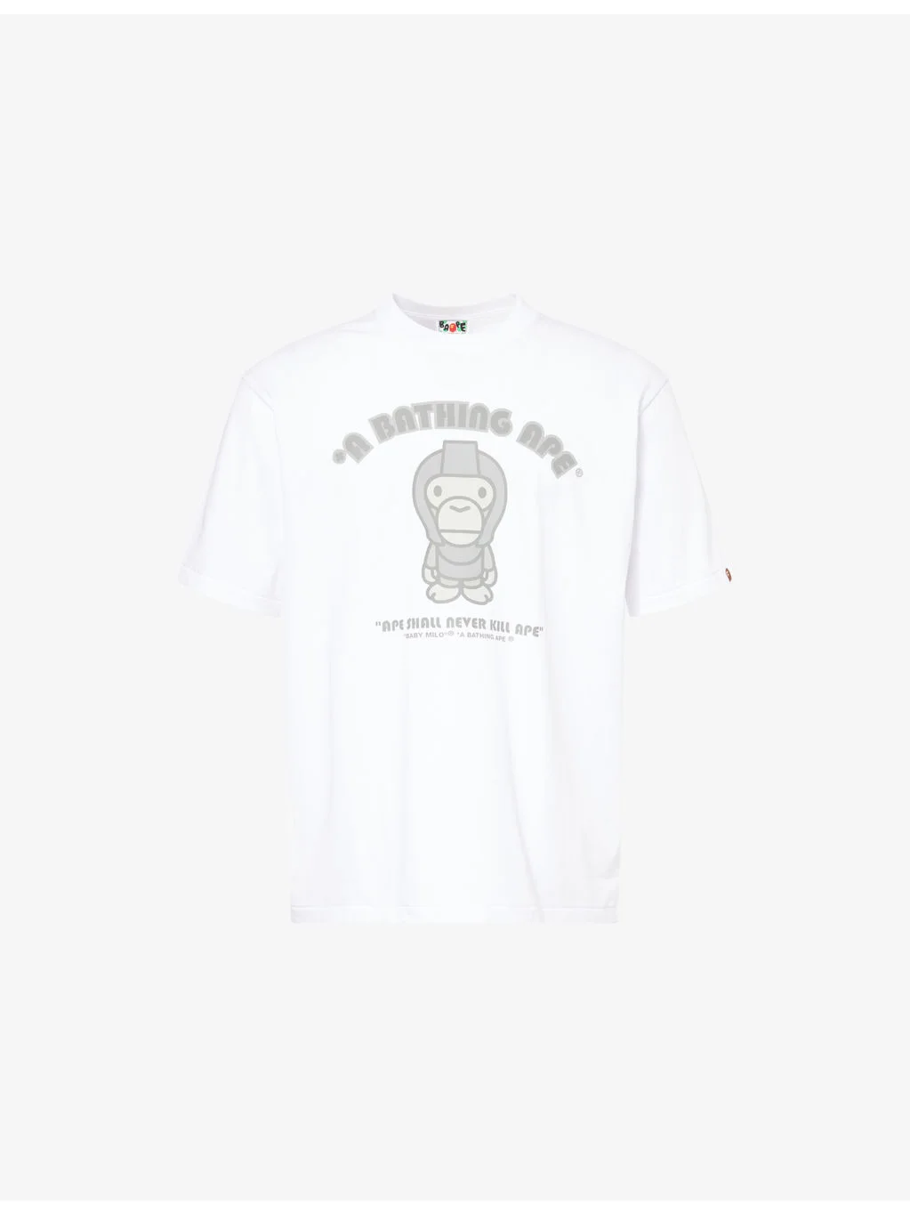 PRODUCT DETAILS - A Bathing Ape cotton-jersey T-shirt - 100% cotton - Relaxed fit, crewneck, ribbed trim at neck, dropped shoulders, short sleeves, brand and logo print at front, logo patch embroidered at sleeve, jersey texture - Machine wash at 40°C - Model is 6ft 2in/1.88m and wears a size medium - Lightweight, slight stretch Ref: R04495893