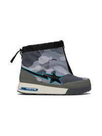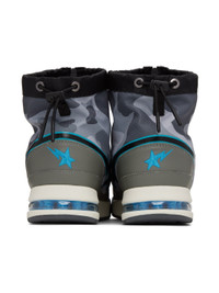 High-top water-resistant nylon ripstop and grained leather sneakers in gray. Transparent rubber trim at heel. · Layered construction · Overlay with zip fastening at vamp · Bungee-style drawstring at collar · Concealed lace-up closure · Logo embroidered at concealed padded tongue · Logo bonded at sides · Logo embroidered at heel · Treaded rubber outsole Supplier color: Gray