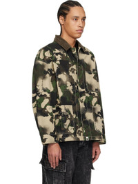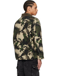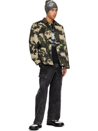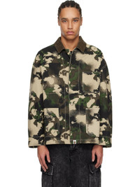Cotton canvas jacket. Logo camouflage pattern printed throughout. - Corduroy spread collar - Button closure - Patch pockets - Logo printed at patch pocket - Logo flag at hem - Buttoned barrel cuffs - Patch pocket at interior - Logo-engraved antiqued gold-tone hardware - Contrast stitching in white Supplier color: Green