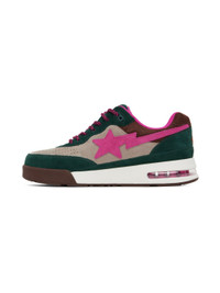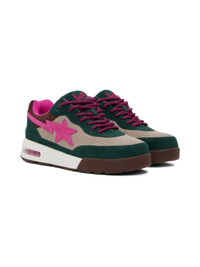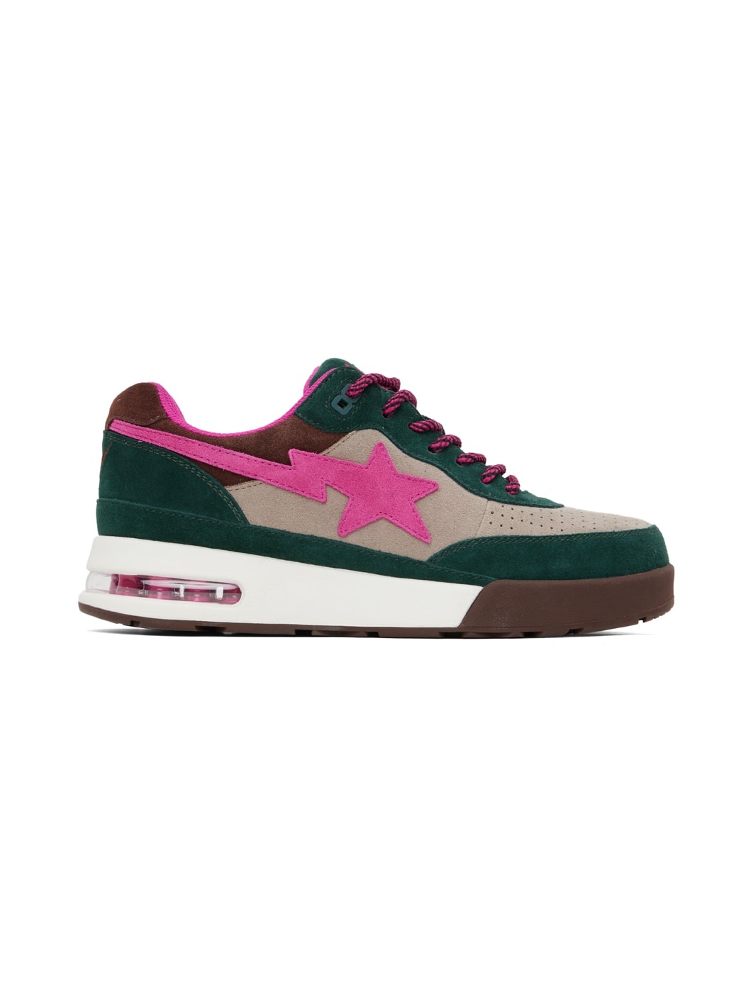 Low-top paneled suede sneakers in green and pink. · Perforated detailing at round toe · Lace-up closure · Logo embroidered at padded tongue and heel counter · Padded collar · Logo appliqué at sides · Mesh lining · Transparent insert at rubber midsole · Treaded rubber sole Supplier color: Pink