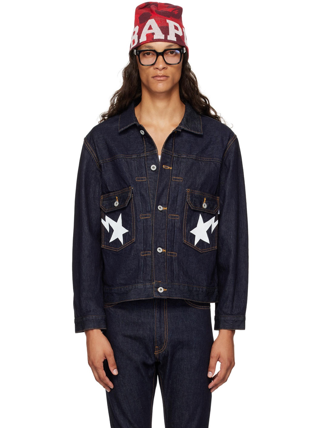 Non-stretch denim jacket. · Spread collar · Button closure · Graphic printed at flap pockets · Adjustable single-button barrel cuffs · Twin pleats at back yoke · Adjustable button tabs at back waist · Logo-engraved silver-tone hardware · Contrast stitching in tan Supplier color: Indigo