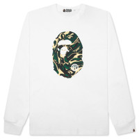 BAPE's Marbling Camo Ape Head Relaxed Fit L/S Tee in White is crafted from pure cotton, ensuring comfort and durability. This tee features a regular fit and showcases a screen-printed design. A woven label on the sleeve adds a subtle touch of branding. - 100% Cotton - Regular fit - Screen printed design - Woven label on sleeve - Style No: 001LTK801309M-WHT