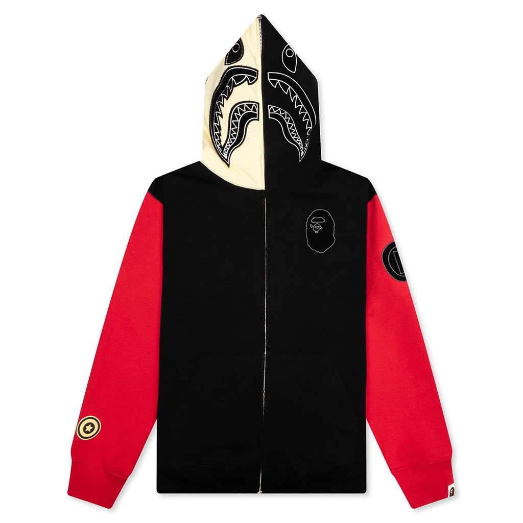 A Bathing Ape presents the Shark Full Zip Hoodie China—the newest addition to its iconic Shark hoodie collection. Adorned in playful color-blocking, the hoodie features a full-zip closure that extends up to the hood. Decorated with velcro loop patches, the hood showcases the signature Shark face logo and BAPE branding. Finished with ribbed trims and a kangaroo pocket. - 100% Cotton - Relaxed fit - Full zip closure to hood - Two-way zipper - Ribbed trims - Kangaroo pocket - Velcro loop patches - BAPE branding - Woven brand tag at hem - Style No: 001ZPK701305M-BLK