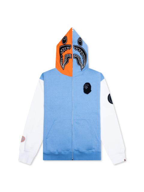 A Bathing Ape presents the Shark Full Zip Hoodie Indonesia—the newest addition to its iconic Shark hoodie collection. Adorned in playful color-blocking, the hoodie features a full-zip closure that extends up to the hood. Decorated with velcro loop patches, the hood showcases the signature Shark face logo and BAPE branding. Finished with ribbed trims and a kangaroo pocket. - 100% Cotton - Relaxed fit - Full zip closure to hood - Two-way zipper - Ribbed trims - Kangaroo pocket - Velcro loop patches - BAPE branding - Woven brand tag at hem - Style No: 001ZPK701309M-BLU