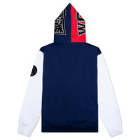 A Bathing Ape presents the Shark Full Zip Hoodie UK—the newest addition to its iconic Shark hoodie collection. Adorned in playful color-blocking, the hoodie features a full-zip closure that extends up to the hood. Decorated with velcro loop patches, the hood showcases the signature Shark face logo and BAPE branding. Finished with ribbed trims and a kangaroo pocket. - 100% Cotton - Relaxed fit - Full zip closure to hood - Two-way zipper - Ribbed trims - Kangaroo pocket - Velcro loop patches - BAPE branding - Woven brand tag at hem - Style No: 001ZPK701302M-NVY
