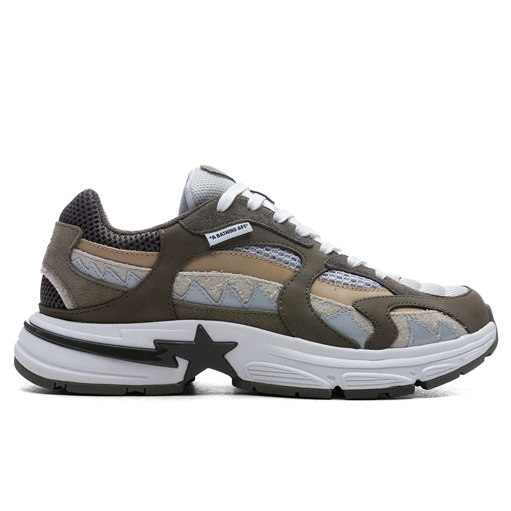 A bold evolution of BAPE’s signature sneaker design, the Shark STA blends premium materials with unmistakable street energy. This low-top silhouette arrives in a fresh colorway, constructed from a mix of materials like mesh, suede, and leather for a dynamic, layered look. Graphic appliques at the side panel nod to the brand’s iconic motifs, while a logo patch at the padded tongue and a branded heel tab reinforce its heritage. The shoe is finished with a mesh lining, cushioned midsole with logo detailing, and a treaded rubber outsole. - Leather, suede, and mesh upper - Graphic appliques - Lace closure - STA logo - Rubber outsole - Style No: 001FWK701315M-OLD