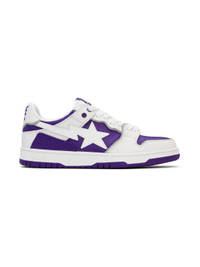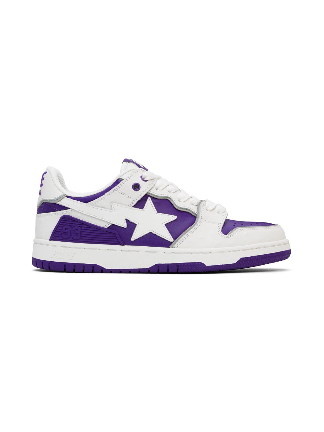 Low-top paneled buffed leather and ostrich-embossed leather sneakers in purple. · Perforated detailing at toe · Lace-up closure · Logo flag at padded tongue · Padded collar · Graphic applique at sides · Rubberized patch at outer side · Logo embroidered at heel tab · Mesh lining · Logo embossed at textured rubber midsole · Treaded rubber sole Supplier color: Purple