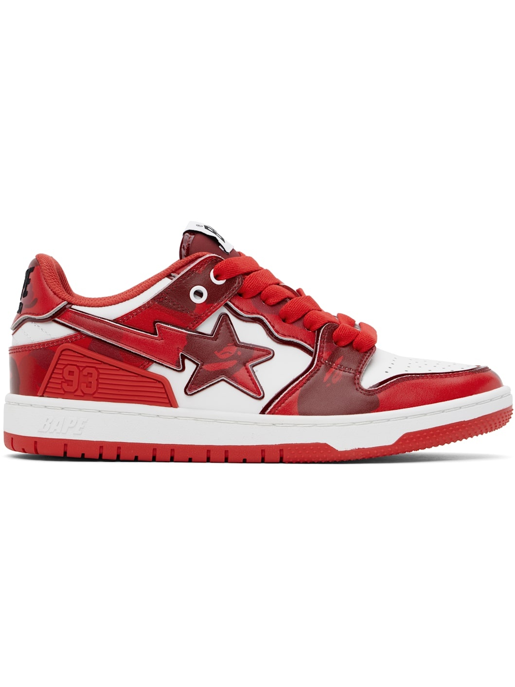 Low-top buffed leather sneakers in red and white. · Logo camouflage pattern printed throughout · Perforated detailing at toe · Lace-up closure · Logo patch at padded tongue · Padded collar · Graphic applique at sides · Rubberized logo patch at outer side · Logo embroidered at heel tab · Jersey lining · Logo embossed at textured rubber midsole · Treaded rubber sole Supplier color: Red