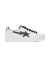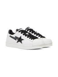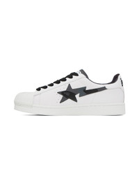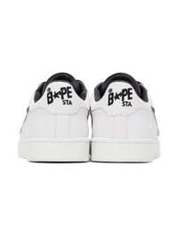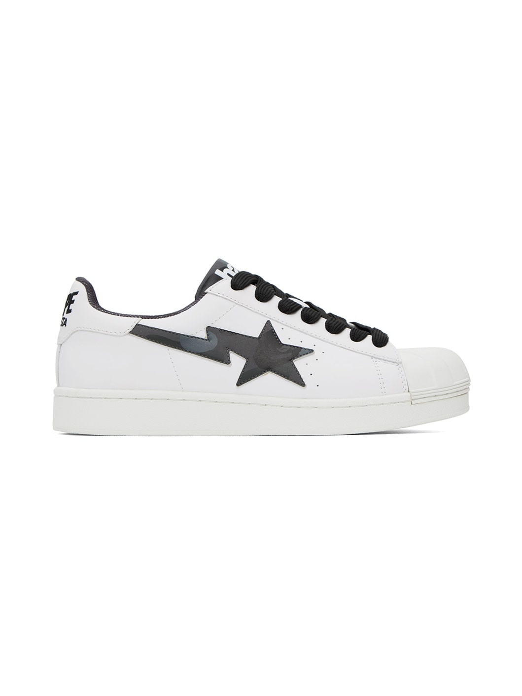 Low-top buffed leather sneakers in white and black. Graphic appliqué with logo graphic camouflage pattern at sides. · Rubber cap toe · Lace-up closure · Logo bonded at padded tongue · Padded collar · Perforated detailing at sides · Logo embroidered at heel tab · Mesh lining · Treaded rubber sole Supplier color: Black