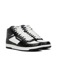 Mid-top quilted buffed leather sneakers in white and black. Logo graphic embossed throughout. · Lace-up closure · Logo patch at padded tongue · Padded collar · Logo bonded at outer side · Mesh lining · Logo embossed at rubber midsole · Treaded rubber outsole Supplier color: Black