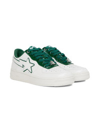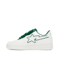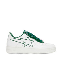 Low-top paneled patent leather sneakers in white and green. · Perforated detailing at round toe and sides · Logo graphic plaque at lace-up closure · Logo patch at padded tongue · Padded collar · Logo appliqué at sides · Logo embossed at outer side, heel tab, and midsole · Textured rubber midsole · Treaded rubber outsole Supplier color: Green