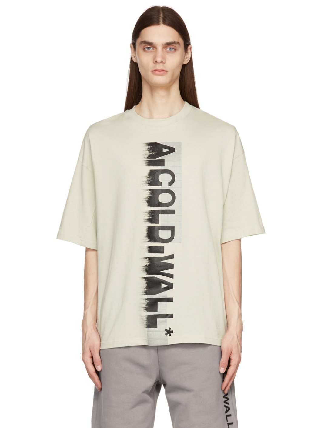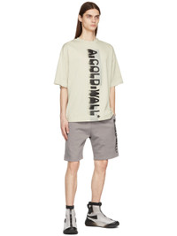 Short sleeve cotton jersey T-shirt in beige. Logo and graphic printed in black and metallic silver-tone at front. Supplier color: Bone 100% cotton.