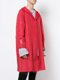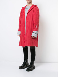 hooded raincoat Red hooded raincoat from A-COLD-WALL* featuring an open front, long sleeves, a printed logo, a straight hem and a back slit at the hem. Made in United Kingdom Composition Nylon 100% SIZE & FIT Model measurements Height 6 ft 1 in(1.85 m) Bust/Chest 33.85 in(86 cm) Hips 31.88 in(81 cm) Waist 29.92 in(76 cm) Washing instructions Machine Wash