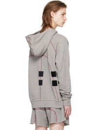 345 gsm French terry hoodie. Raw edges throughout. · Paneled construction · Drawstring at hood · Logo embroidered at chest · Kangaroo pocket · Rib knit hem and cuffs · Raglan sleeves · Rubberized logo patch at sleeve · Velcro patches at back · Contrast stitching in red Supplier color: Cement