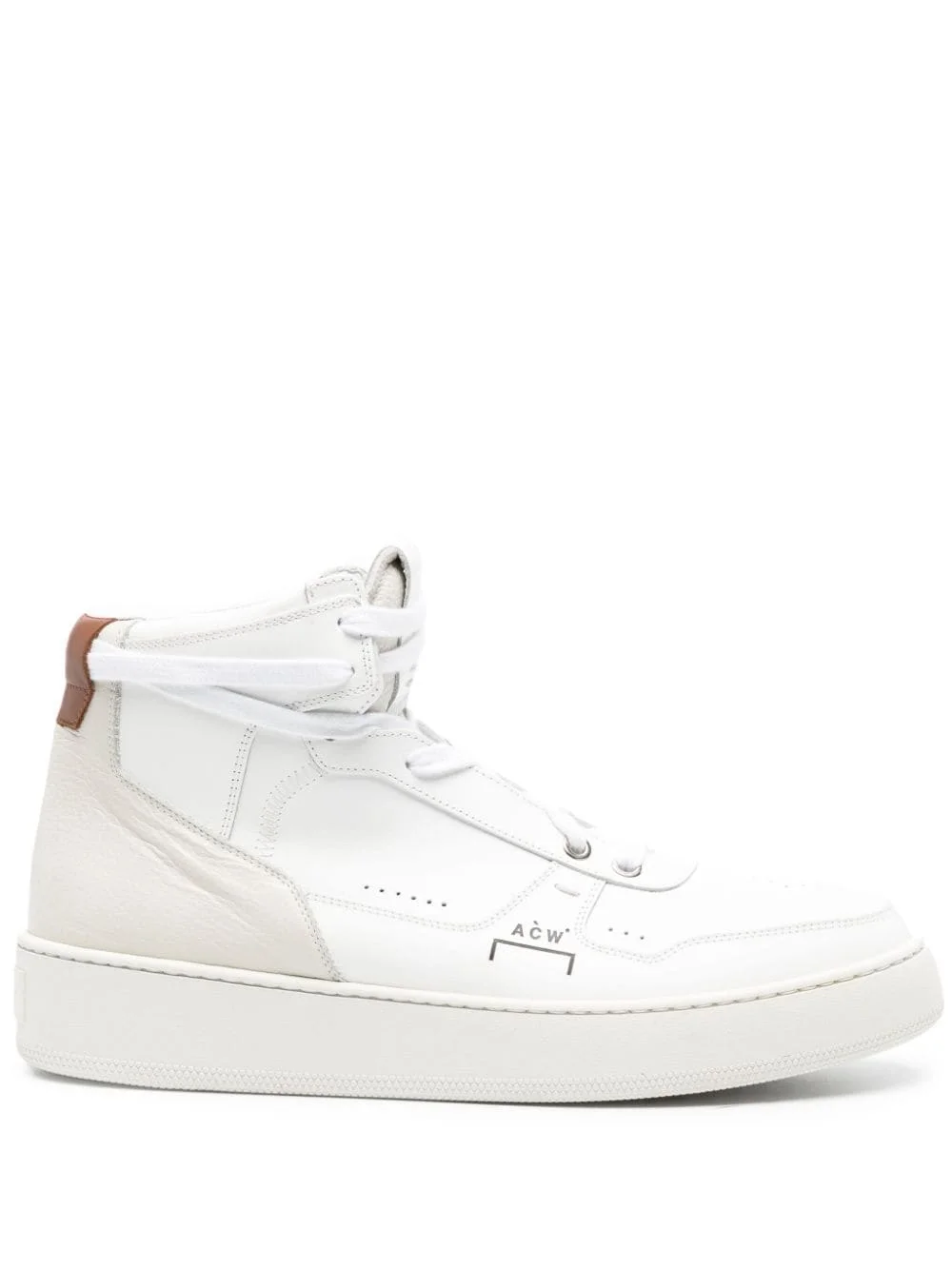 Luol high-top leather sneakers Modelled on basketball styles, A-COLD-WALL*'s Luol sneakers are crafted from smooth, satin-finish leather custom-developed with ECCO. Their sporty high-top silhouette is equipped with a padded, reinforced ankle and secure lace-up fastening. They’re finished with signature logo detailing at the sidewall and heel counter. Highlights - White - Calf leather - Smooth grain - Logo print to the side - Logo patch at the tongue - Contrasting branded heel counter - Logo at the sole - Round toe - Front lace-up fastening - Branded insole - Rubber outsole Made in Italy Composition Lining: Rubber 100%, Calf Leather 100% Outer: Calf Leather 100% SIZE & FIT Measurement HEEL 1.37 in(3.5 cm) Sole height 0.98 in(2.5 cm) HEIGHT 3.93 in(10 cm)