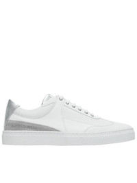 A Cold Wall low-top paneled buffed leather sneakers in white/grey, round toe, tonal lace-up closure, logo embossed at padded tongue, padded collar, logo embossed at outer sides, silver heel panel, tonal crepe rubber midsole and outsole, tonal hardware. Made in Portugal. U.S. sizing. Composition - Leather, Rubber.
