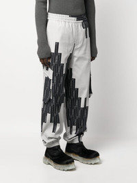 Vector-monogram tapered trousers A-COLD-WALL* showcases its penchant for contemporary industrial design in these trousers. Crafted from stretch cotton, they're elevated with the collection's graphic vector print – a reinvention of the monogram uniting logo in repeat. The pair comes in a tapered silhouette and is finished with side cargo pockets and elasticated ankles. Highlights - Black/light grey - Stretch-cotton - Monogram pattern - Elasticated waistband - Concealed front fastening - Two side cargo pockets - Rear welt pocket - Tapered leg - Elasticated ankles Imported Composition Cotton 98%, Elastane 2% SIZE & FIT Model measurements Height 6 ft 0 in(1.84 m) Bust/Chest 35.82 in(91 cm) Hips 37 in(94 cm) Waist 28.34 in(72 cm) FittingInformation Designed for a relaxed tapered leg, allowing a comfortable loose fit above the knee with a closer fit towards the calves The elasticated hem at the ankle allows for movement and a comfortable fit Made from a midweight stretch fabric, this piece offers elasticity and flexibility when worn This piece fits true to size – take your usual size Washing instructions Dry Clean Only