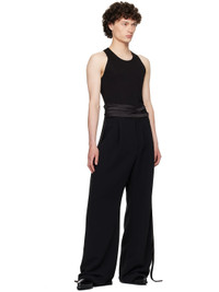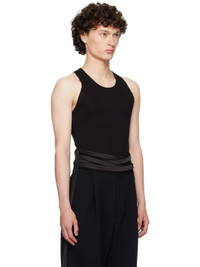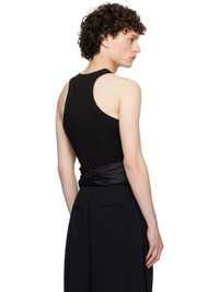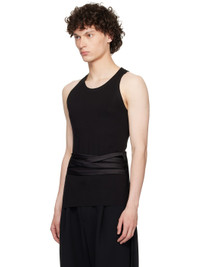 Viscose jersey tank top. Raw edges throughout · Scoop neck · Fixed satin self-tie belt at waist · Racer back · Satin trim at interior seams Supplier color: Black Body: 100% viscose. Trim: 100% polyester. Made in United Kingdom 252678M214000