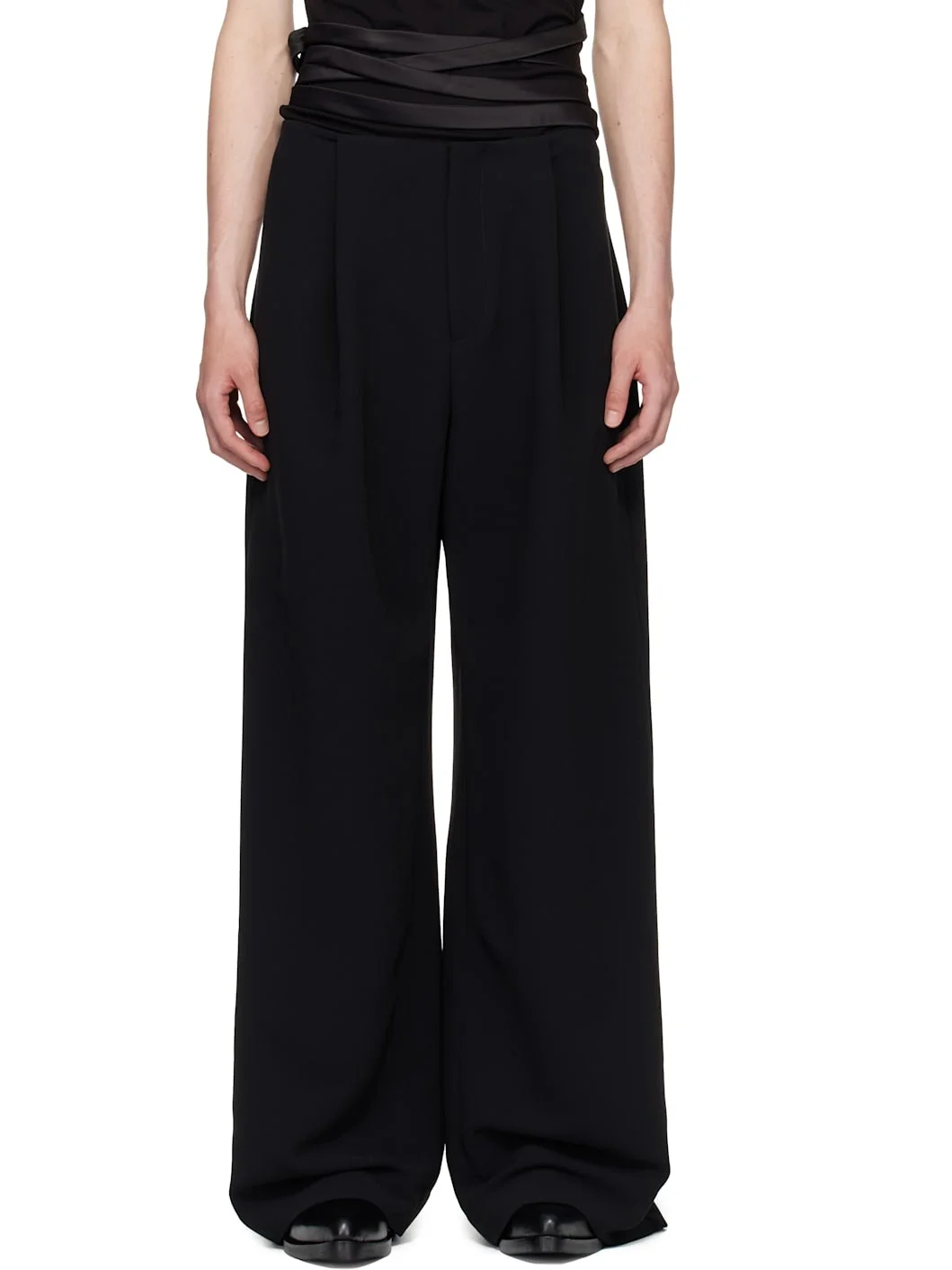 Polyester crepe trousers. · Four-pocket styling · Zip fly · Pleats at front Supplier color: Black Body: 100% polyester. Lining: 100% cotton. Made in United Kingdom 252678M191000