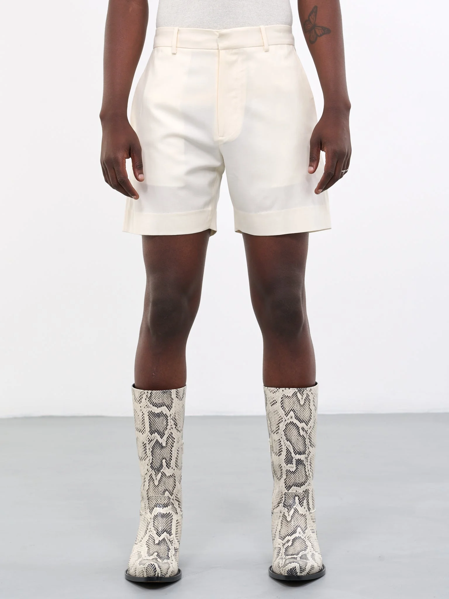 AARON ESH shorts in ivory, lightweight wool, semi-sheer, mid-waist, belt loops, hook & eye zip-fly fastening, side seam & back welt pockets, short length, tailored fit. Made in UK Standard Sizing 100% Wool Model is 6’0” wearing size M. Shoulders: 18” Chest: 33” Waist: 28”
