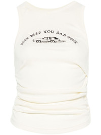 ruched tank top Highlights - Off-white - Organic cotton - Jersey texture - Ruched detailing - Crew neck - Sleeveless - Slogan print to the front - Illustration-style print - Embroidered logo to the rear - Straight hem - When buying this unisex item, keep in mind that it is graded in standard men's sizing. Imported Composition Organic Cotton 100% SIZE & FIT Measurement CHEST 22.83 in(58 cm) LENGTH 20.07 in(51 cm) Washing instructions Machine Wash