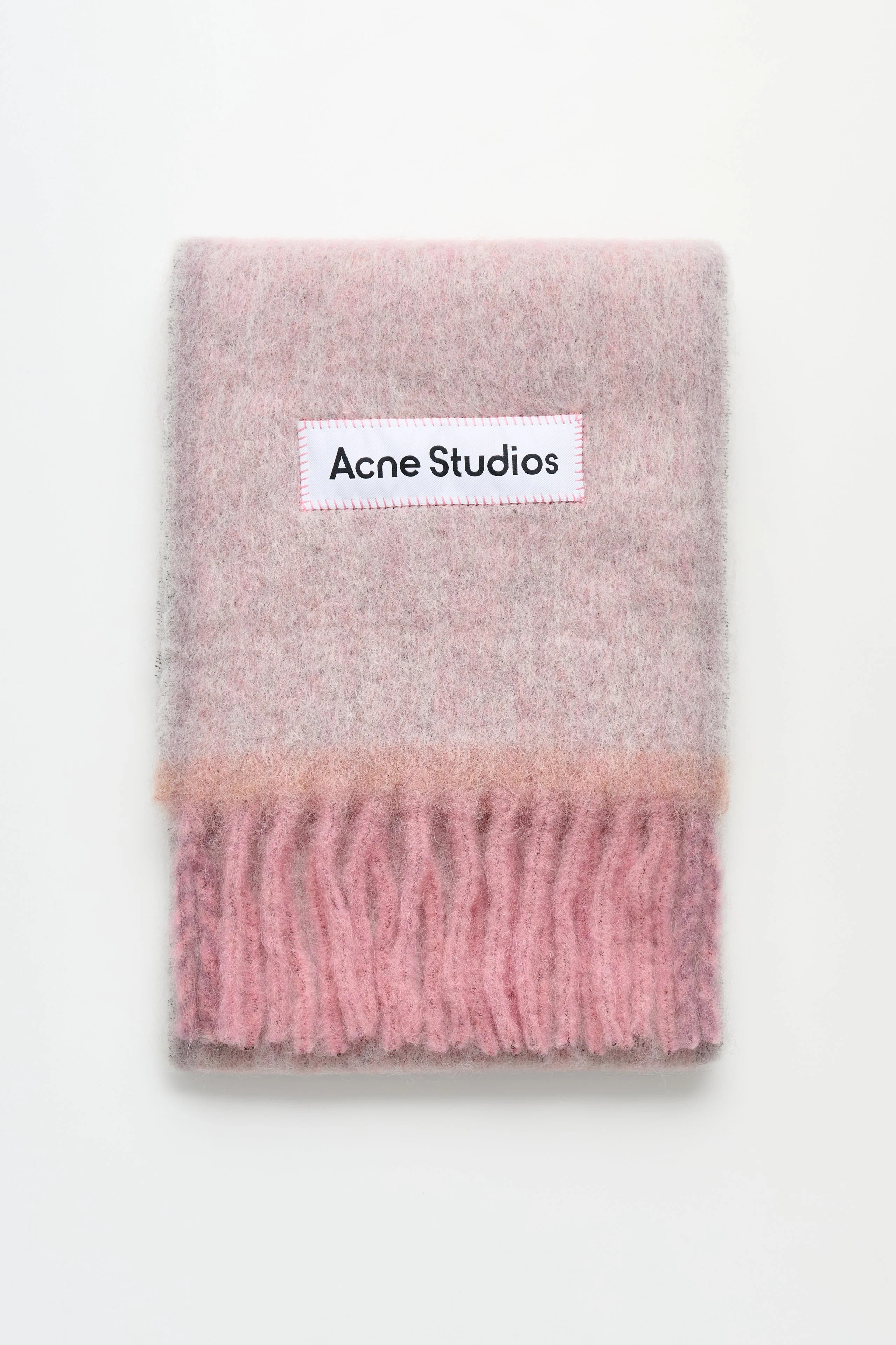Knitted scarf from Acne Studios. Cut to a long rectangular shape in dusty pink with mint green and orange panels. Made from an alpaca and mohair wool blend with a brushed surface. Features fringed short ends and a contrast woven frame. Detailed with a logo patch set near one hem.