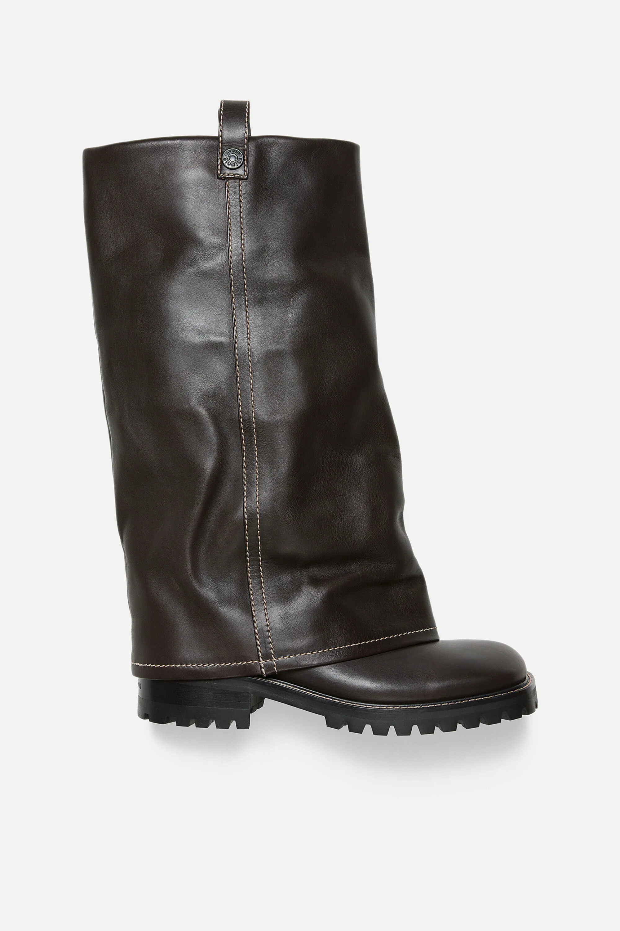 Boots crafted in leather with a tanned finish and contrast stitching, detailed with a belted branded buckle and folded shaft construction. - Pull on boots - Below the knee - Folded shaft - Belted and branded metal buckle - Contrast stitching - Sole height: 25 mm - Heel height: 50 mm - Style ID: FN-MN-SHOE000300 - Uppers: 100% Preferred cow leather, Lining: 100% Preferred calf leather, Soles: 100% Rubber
