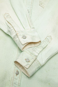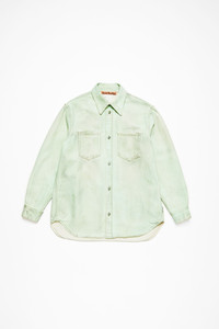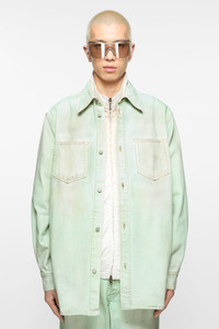 Button-up shirt is cut to a relaxed unisex fit wit dropped shoulders, extra long sleeves and hip length. Complete with chest pockets and centre front stud button-up closure. Crafted from non stretch denim in a mint green wash. - Relaxed unisex fit - Dropped shoulders - Extra long sleeves - Hip length - Button-up closure - Chest pockets - Female model is 179 cm / 5′11 and wears a size XS - Male model is 183 cm / 6′ and wears a size M - Style ID: FN-UX-SHIR000051 - Shell: 100% Cotton