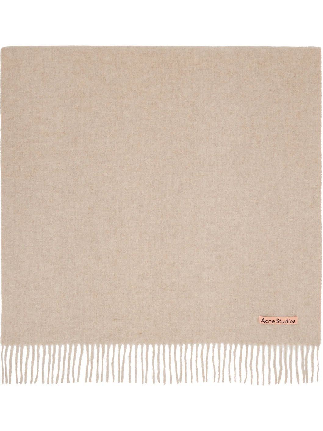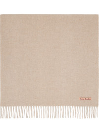 Rectangular RWS-certified wool flannel scarf. · Logo patch at face · Fringed detailing at ends · L78" x W27.5" Supplier color: Oatmeal melange 100% wool. Made in Italy 252129M150002